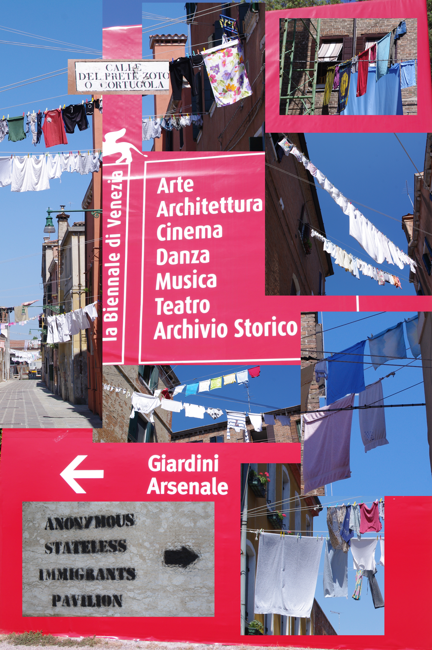 “The first in a remarkable series of images entitled Venice on the Line (I) that specifically challenges the rhetoric of this year’s Biennale in Venice. It is explicitly intended as a play on the English expression ‘on the line’, both highlighting the artist’s intention to put his work ‘on the line’, but also emphasising the lived experience of Venices’s urbanscape in which the daily clothing of Venetians is left to gather the city’s air ‘on the line’ for all to see. It makes vivid use of the juxtaposition of the primary colours of red and blue: the red of the Biennale signage against the blue of the Venetian sky. These colours are picked out in the choice of clothing and bed linen: the red underpants and t-shirt against the blue sky and sheets; the blue sheets against the soft browns of the built fabric. This is not the Venice of the canals and gondoliers, but rather the rectilinear residential blocks to the north of the Giardini and east of Arsenale as indicated in the signage in the lower third of the image. Cleverly, this is opposed by the street name Calle del Prete Zoto o Cortugola. This juxtaposition emphasises the combination of Arte and Architettura highlighted at the top of the Biennale sign, but removes it from the usual ‘place’ of the exhibitions and brings to attention the daily lives of poorer Venetians. The dominant whiteness of most of the washing set against the blue sky, intentionally matches the whiteness of the writing against the red background of the signage. Dominant, at the bottom left of the image, and pointing away from the Giardini/Arsenale arrow, is the widespread Anonymous Stateless Immigrants Pavilion sign, emphasising the artist’s commitment to the alternative tradition exemplified by Venice on the Line (I).”