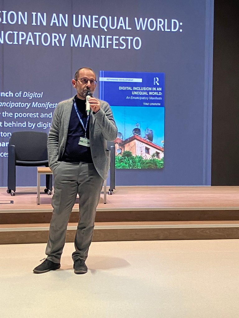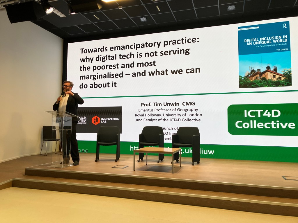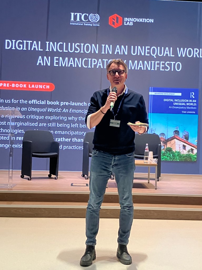 I am so very grateful to Tom Wambeke and the team at the Innovation Lab at the ITCILO (International Training Centre of the International Labour Organisation) who hosted a pre-launch event for my upcoming book, Digitial Inclusion in an Unequal World: an Emancipatory Manifesto on their magnificent campus in Turin on 1st December. It was a very special event – I have to admit to having been even more nervous than usual beforehand – and I was very humbled by the contributions of Tom himself, Ugo Vallauri, Ed Canela, Juan Carlos de Martin (Nexa Centre for Internet and Society, Polytechnic of Turin), and Fabio Nascimbeni (European Training Foundation), who were all most generous in their reflections. A copy of my presentation focusing on the UN and Innovation is available here.