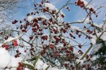 Looking out into the back garden this morning, across the tracks of the Muntjac deer that crept in over the snow yesterday, I saw a small flock of fieldfare – beautiful birds from the same family as the much more common song thrush. Sadly, they are on the Royal Society for the Protection of Birds’ (RSPB) Red List, indicating that they are of the highest conservation priority. I have never seen them before where we live, and they seem to have been attracted by the hawthorn berries and rose hips in the hedge at the end of the garden. As the RSPB says, fieldfares are “Best looked for in the countryside, along hedges and in fields. Hawthorn hedges with berries are a favourite feeding area”.